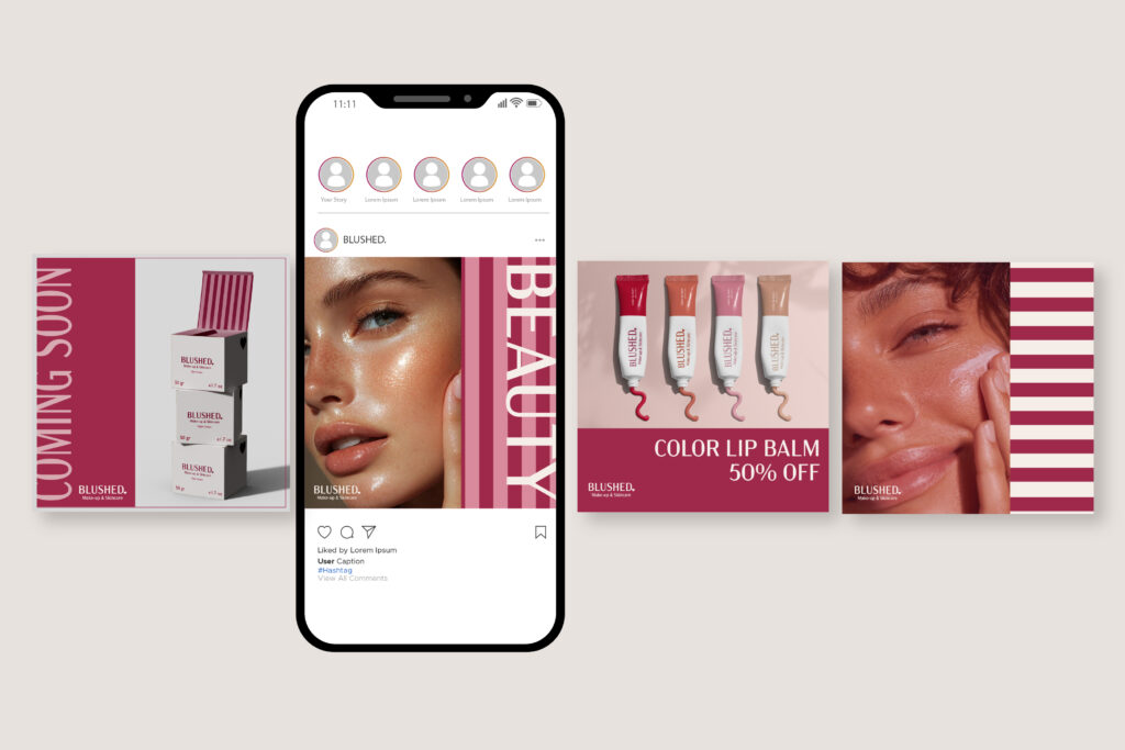 Voor deze opdracht heb ik een eigen merk bedacht: Blushed – Make-up & Skincare. Voor dit merk heb ik een complete visuele identiteit ontwikkeld. Ik heb een logo ontworpen, verpakkingen vormgegeven en Instagram-posts gemaakt om het merk online te presenteren.