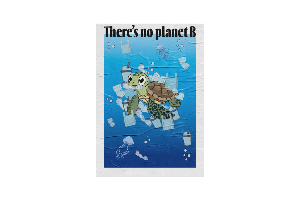 Voor deze opdracht mocht ik een protestposter ontwerpen rond een maatschappelijk thema. Ik heb gekozen voor milieubescherming, omdat ik het belangrijk vind dat mensen zich bewuster worden van de gevolgen van plasticvervuiling. Op mijn poster staat een schildpad die vastzit in plastic afval, met de slogan “Thereʼs no planet B.”
