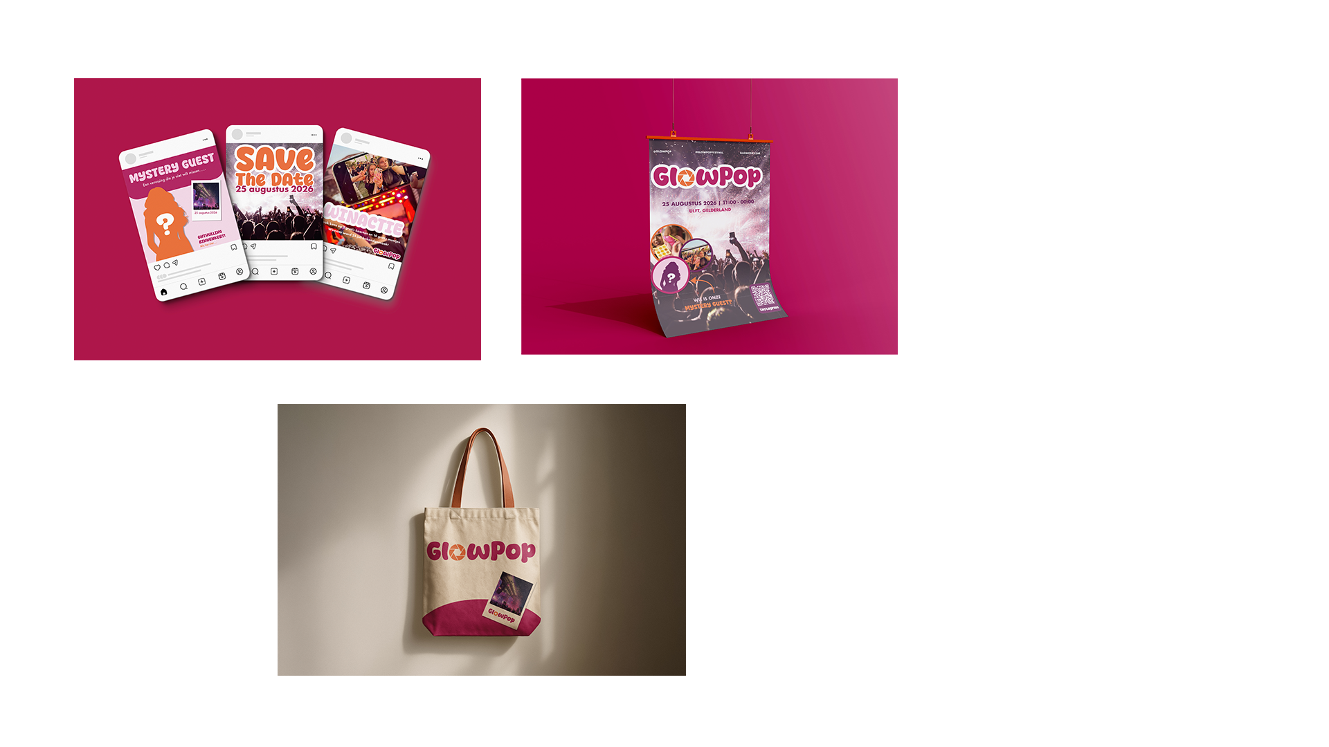 De huisstijl is gebaseerd op de kleuren oranje en roze: felle, opvallende kleuren die zorgen voor een energieke en drukke uitstraling. Hiermee wilden we het vrolijke en uitbundige karakter van het festival benadrukken. Door de opvallende kleuren en speelse vormgeving sluit alles goed aan bij de sfeer die we met Glowpop wilden neerzetten.