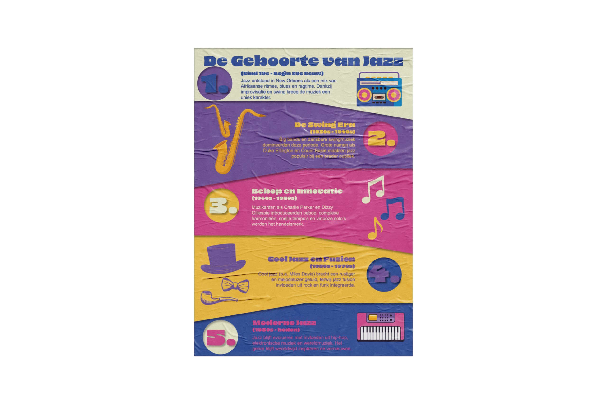 Ik koos voor felle kleuren om de energie en levendigheid van Jazz goed over te brengen. Tijdens deze opdracht heb ik geleerd hoe kleur en opmaak kunnen helpen om geschiedenis op een aantrekkelijke manier te presenteren